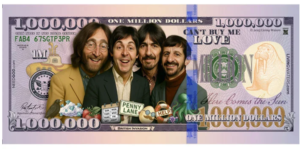 Ce tract en édition spéciale est très facile à distribuer, car ces quatre gars sont connus dans le monde entier. Il contient quelques « clins d'œil » pour les fans et une présentation claire de l'Évangile (en français) inspirée par « Imagine » de John.
